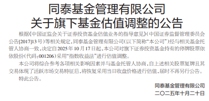 中国经济网北京10月21日讯:昨日,同泰基金管理有限公司发布基金估值调整公告。 According to the same announcement, Dotai Fund Management Co., Ltd., after discussions with related fund managers, decided to use the “indexed income method” to adjust the valuation of Yiyi’s retained shares (code: 001206) held by the company’s securities investment fund since October 17, 2025. The company says it will comprehensively consider a variety of related influencing factors and negotiate with the fund administrator. After the related stocks mentioned above resume operations and reflect the characteristics of active operations inmarket, we plan to resume evaluation based on the day’s closing price and no further announcements will be made at that time.