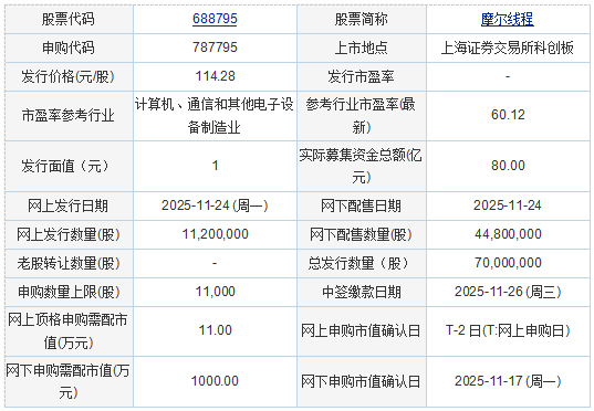 摩丝智能科技(北京)有限公司 发起人(总经理):中信证券股份有限公司 副总经理:招商证券股份有限公司、中银国际证券股份有限公司、广发证券股份有限公司 刊发情况: 公司简介:公司主要从事GPU及相关产品的研发、设计和销售。公司自2020年成立以来,专注于自主研发、功能齐全的GPU,专注于为人工智能、数字孪生、科学计算等高性能计算领域提供计算加速平台。截至招股说明书签署日,我们不存在持股 30%以上的股东,也不存在控股股东。截至2025年6月30日,张建中先生何先生直接持有公司11.06%的股份,何先生通过南京深舍间接持有公司1.62%的股份,并通过杭州华奥、杭州初高中、杭州金高级三个员工参与平台间接持有公司0.05%的股份,合计持股12.73%。公司股份数量。同时,张建中先生与南京神娘、杭州华奥股票平台签订了参股协议(参股期限至任何一方不再持有发行人股份之日),并担任杭州华奥、杭州初高中、杭州金高三个员工持股平台的执行合伙人(虽然参与率较低,但根据联营协议持续稳定控制三个员工持股平台),公司持股总额控制36.36%,为公司实际控制人。根据摩尔 Th2025年11月14日,公司首次公开发行股票并发布科创板上市招股书,公司公告称,摩尔线程新一代自主可控AI嵌入式芯片及训练研发项目——摩尔线程新。表示募集资金8亿元,用于新一代摩尔线程自主可控图形芯片研发项目、新一代摩尔线程自主可控AISoC芯片研发项目及其补充项目。营运资金。摩尔线程2025年11月21日披露的首次公开发行股票并在科创板上市的情况显示,按照发行价114.28元/股、发行新股7000万股计算,若发行成功,公司预计共募集资金79.996亿元。扣除发行费用(不含增值税)4元后2,354.77万元,预计融资净额为757,605.23万元。