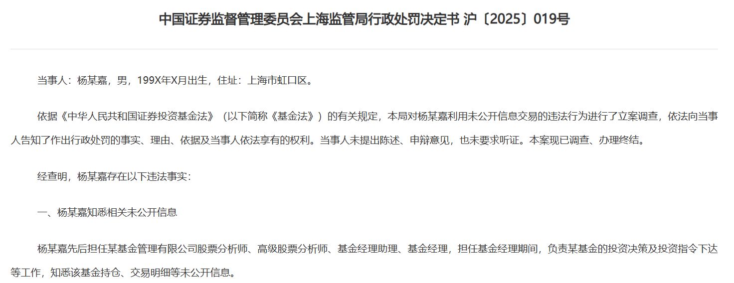 全体记者|黄小聪出版社|肖瑞东 近日,中国证监会上海监管办公室公布了行政处罚决定。判决书显示,杨慕佳利用以基金管理人身份获取的非公开信息,明示或暗示陈慕东从事相关经营活动,最终被处以50万元罚款。记者注意到,杨某甲先生的相关任职信息与海富通基金前基金经理杨宁甲先生的信息非常相似。杨宁嘉于2017年5月加入海富通基金,2021年9月开始担任基金经理,管理过三只基金。 2024年10月14日,杨宁佳辞去所有产品管理职务。另一只基金是“Rat Position”。具体而言,杨牧甲先生负责某基金的投资决策和下达投资指令,并知晓该基金的持仓、交易详情等未公开信息。杨木甲先生在担任基金管理人期间,利用以其身份获取的非公开信息明示或暗示陈木东先生从事相关业务活动。 《日刊经济新闻》记者获悉,陈木东使用的证券账户(包括普通账户和信托账户)于2014年开立,资金来源和去向主要是本人及其亲友,由陈木东本人管理和使用。陈木东的证券账户存在上述资金的汇合交易,但制裁决定中并未披露汇合交易的具体金额。中国证券监督管理委员会上海监管办公室证监会认为,杨穆家族的上述行为违反了基金法第二十条第六款的规定,属于基金法第一百二十三条第一款所述的情形。最终,证监会上海监管办公室决定按照相关规定,对杨木家族作出责令改正,并处以50万元罚款。最低的就业回报是近 40% 的损失。政治处罚决定书还指出,杨牧佳曾在某基金管理公司担任股票分析师、高级股票分析师、助理基金经理、基金经理等职务。经比对相关行业信息,杨某甲可能是海富通基金原基金经理杨宁甲。公开资料显示,杨宁嘉于2017年5月加入海富通基金,担任股票分析师、高级股票分析师。自2020年12月起,担任助理HFT 电子媒体行业的 nt 股权基金经理。 2021年9月开始担任海富通电子传媒产业股票基金经理。 2022年12月2日起担任海富通新内需组合基金经理。2024年6月13日起担任海富通数字经济组合基金经理。 2024年10月14日,杨宁嘉先生同时辞任该三只基金的基金经理职务。从时间角度来看,管理高频交易数字经济组合只需要很少的时间,超过 100 天。需要说明的是,此时给出的离职原因是个人原因。如今“老鼠仓库”被曝光,这或许才是他辞职的真正原因。而且,从业绩来看,杨宁甲任职期间不少基金的回报并不理想。其中,海富士电子传媒持股3年以上,C类股就业业绩近-40%。在更多的在管理 HFT 新的内需组合一年后,就业回报率接近-20%。